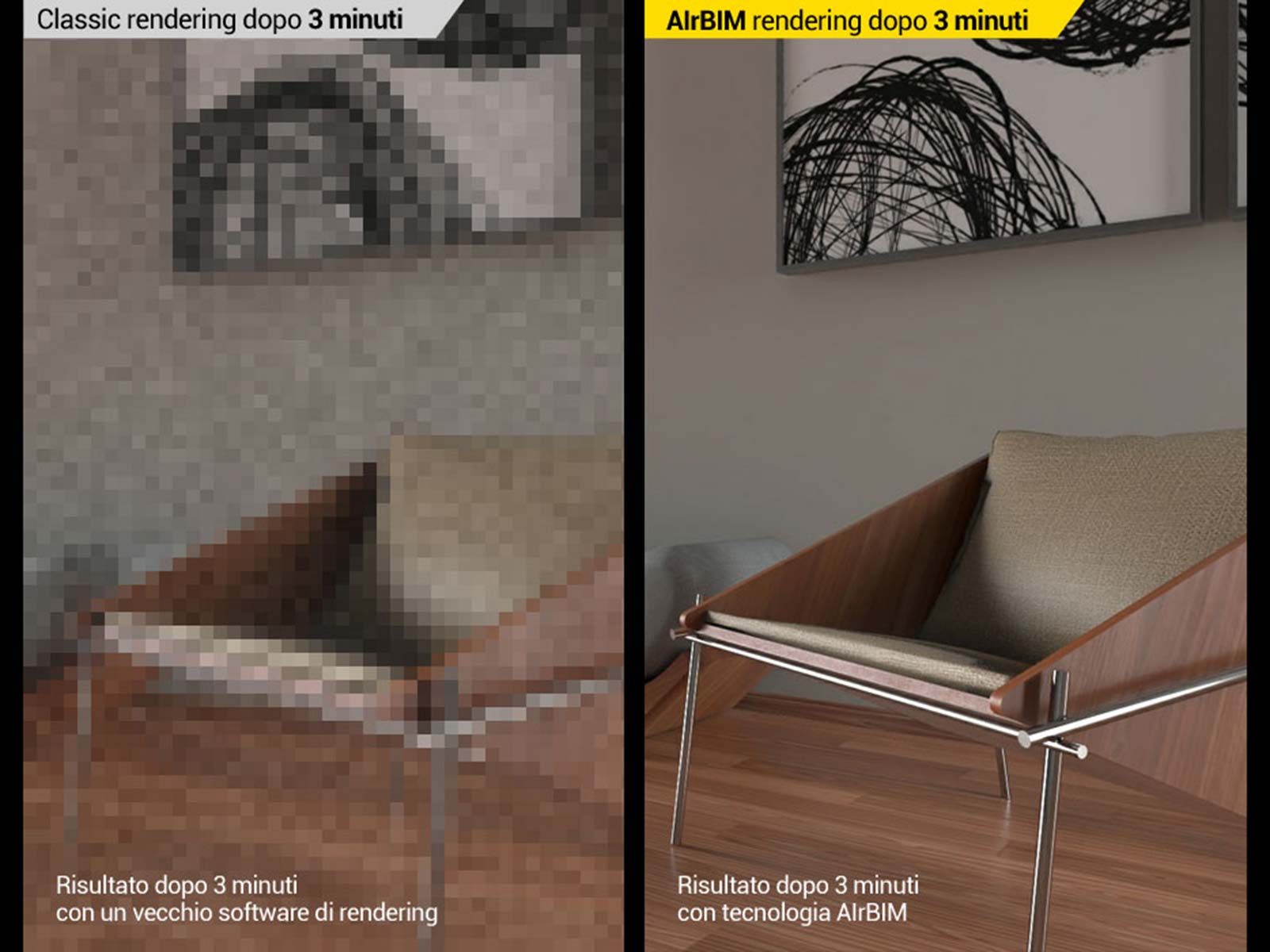 non occorre fare alcun settaggio per limitare il tempo di rendering, come succede con i vecchi software di rendering. In AIRBIM l’algoritmo di Intelligenza Artificiale individua in automatico il percorso più veloce e i