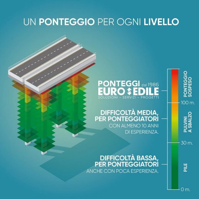 Lavori qualificati che richiedono installazioni sospese anche a 100 metri da terra, come i viadotti, non sono fattibili se non c’è un buon bagaglio professionale pregresso. La squadra che affronterà questo genere di sfida, dovrà aver maturato almeno 12/15 anni in cantiere ed essere supportata da un valido team di tecnici: una delle poche realtà in Europa altamente qualificate è proprio Ponteggi Euroedile.