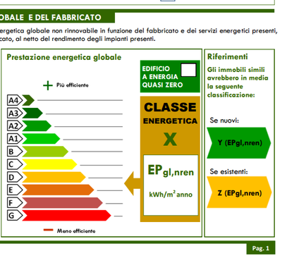 – nella prima pagina dell’APE, nella sezione “Riferimenti”, deve essere indicato l’indice di prestazione energetica (EPgl,nren) e la classe energetica corrispondente (Z), quali valore medi di edifici simili;
