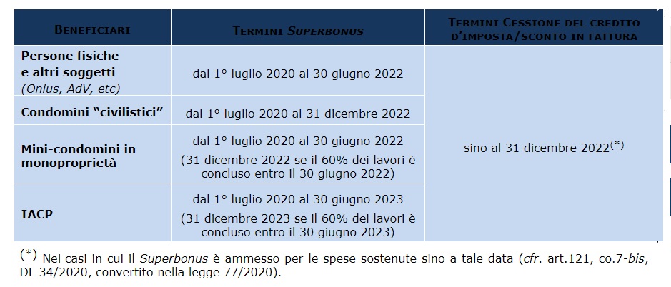 - 30 giugno 2023 per gli interventi eseguiti dagli IACP, comunque denominati, nonché dagli enti aventi le stesse finalità, termine esteso al 31 dicembre 2023, a condizione che al 30 giugno 2023 sia stato eseguito almeno il 60% dei lavori.