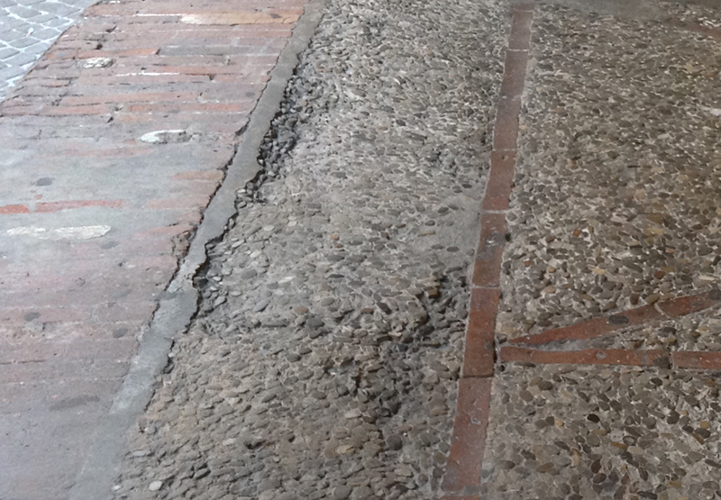 Foto 2 – Danni da umidità ed esposizione alle intemperie nel pavimento di ciottoli cementati (datato 1825) di un portico nel centro storico di Bologna