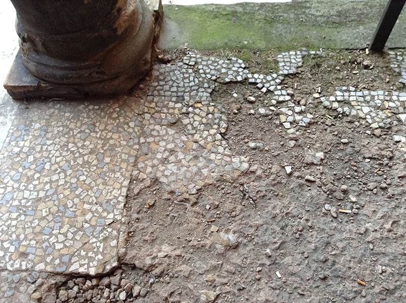 Foto 4 – Pavimento alla veneziana ormai irrecuperabile per il degrado molto avanzato dovuto alla prolungata esposizione alle intemperie, in cui il distacco della semina superficiale evidenzia il sottofondo (o stabilitura) in malta di cocciopesto, molto resistente all’umidità