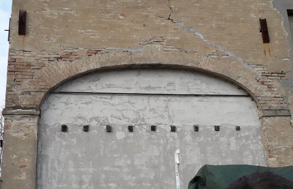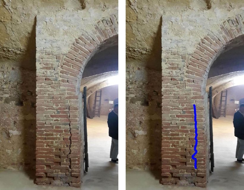 Arco a sesto ellittico probabilmente ottocentesco con le reni costruite secondo il principio della falsa cupola: l’errore costruttivo ha contribuito alla formazione di un quadro fessurativo complesso