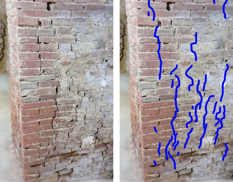 In colonne e pilastri monolitici di pietra, uno schiacciamento in fase precoce si manifesta ad esempio con la formazione di alcune lesioni verticali molto brevi e sottili nella porzione centrale del fusto, che – con l’aggravamento del dissesto – tendono al allungarsi, allargarsi e moltiplicarsi progressivamente, fino ad arrivare alla completa rottura dell’elemento, al formarsi di profonde fessurazioni o perfino all’espulsione di porzioni di materiale (Fig. 9). Un altro indizio prezioso della presenza di dissesti a schiacciamento ormai storicizzati (ma sempre pronti a riattivarsi in caso di aumento dei carichi verticali) è la presenza di antiche cerchiature di ferro battuto.