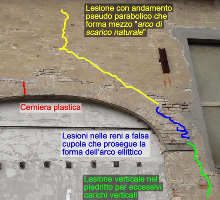 • la formazione di “archi di scarico naturali” nella muratura immediatamente soprastante ad architravi in legno o pietra, oppure ad archi o piattabande non dimensionate correttamente;
