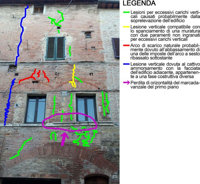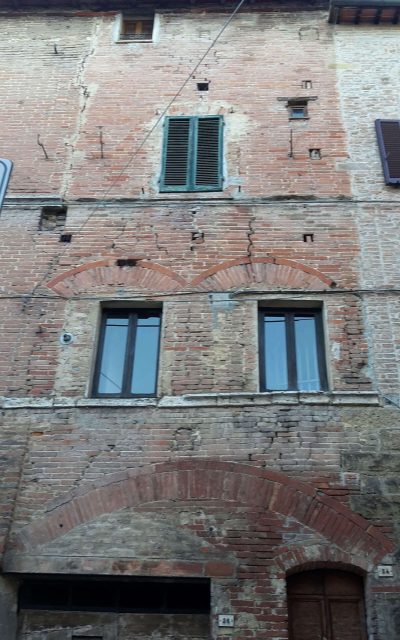 Casa a schiera matura tardo-medievale con un quadro fessurativo esteso e complesso ormai storicizzato
