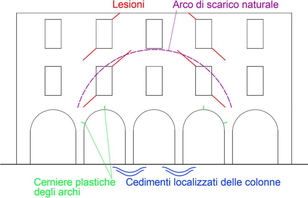 Schema di una palazzina tradizionale con cedimento del terreno sotto alle colonne centrali del portico, con formazione di lesioni a taglio diagonale (evidenziate in rosso), di un arco di scarico naturale (evidenziato in viola) e delle cerniere plastiche per il dissesto a flessione di due archi per abbassamento di una delle imposte (evidenziate in verde)
