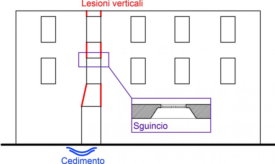 In un cedimento del terreno in corrispondenza di una colonna di (porte e finestre con sguinci o cambiamenti di spessore della muratura le lesioni hanno un andamento tendenzialmente verticale