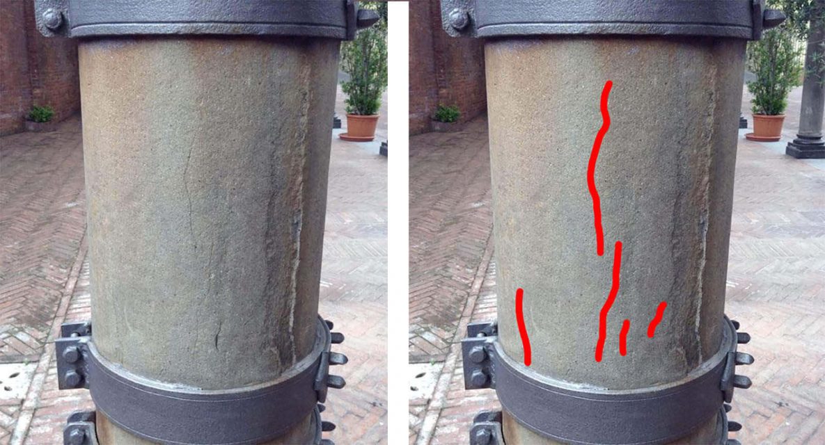Colonna monolitica in pietra con grave dissesto per schiacciamento evidenziato da una serie di lesioni verticali parallele