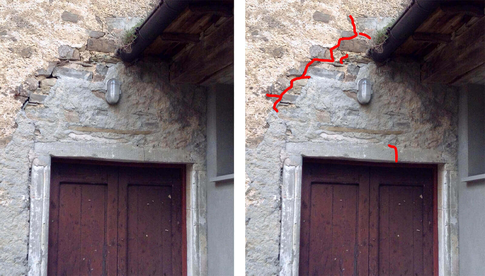 Un dissesto assai comune, tipico soprattutto dell’edilizia minuta tradizionale, è la formazione di lesioni semicircolari o paraboliche nelle porzioni di muratura immediatamente soprastanti l’architrave di una bucatura (Fig. 1); quasi sempre associata alla rottura di un architrave monolitico in pietra (Fig. 2), all’inflessione eccessiva di uno di legno o alla cerniera plastica centrale di archi o piattabande. Nei casi più gravi il dissesto si aggrava fino a comportare il crollo totale o parziale della muratura lesionata (Fig. 3).