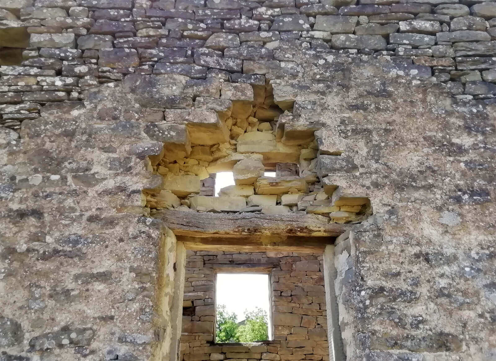 Maschio murario con grave dissesto per schiacciamento evidenziato dal distacco reciproco dei paramenti murari in sezione