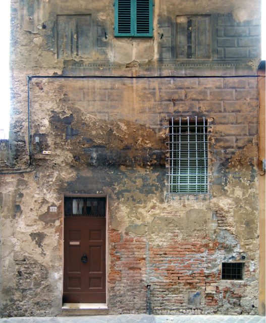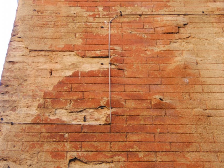 Fronte di risalita in un edificio di edilizia minore. Si noti il colore più scuro della muratura e dell’intonaco e la zona di “bagnasciuga” con mancanza, disgregazione e polverizzazione dei giunti di malta; scagliatura ed efoliazione dei mattoni; formazione di efflorescenze saline; perdita dell’intonaco ed esfoliazione della pellicola pittorica superficiale