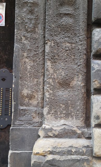 Foto 5 – Portale in arenaria gialla con degrado molto avanzato: mancanze nel basamento, erosione e crosta nera diffusa. L’originario motivo a candelabra è ormai del tutto irriconoscibile