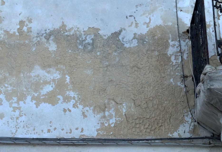 Foto 14 – Esfoliazione di una tinteggiatura al quarzo (non traspirante) su intonaco cementizio dovuta all’umidità della muratura: si tratta di un tipico esempio di degrado dovuta alla scelta di materiali e finiture non adatte