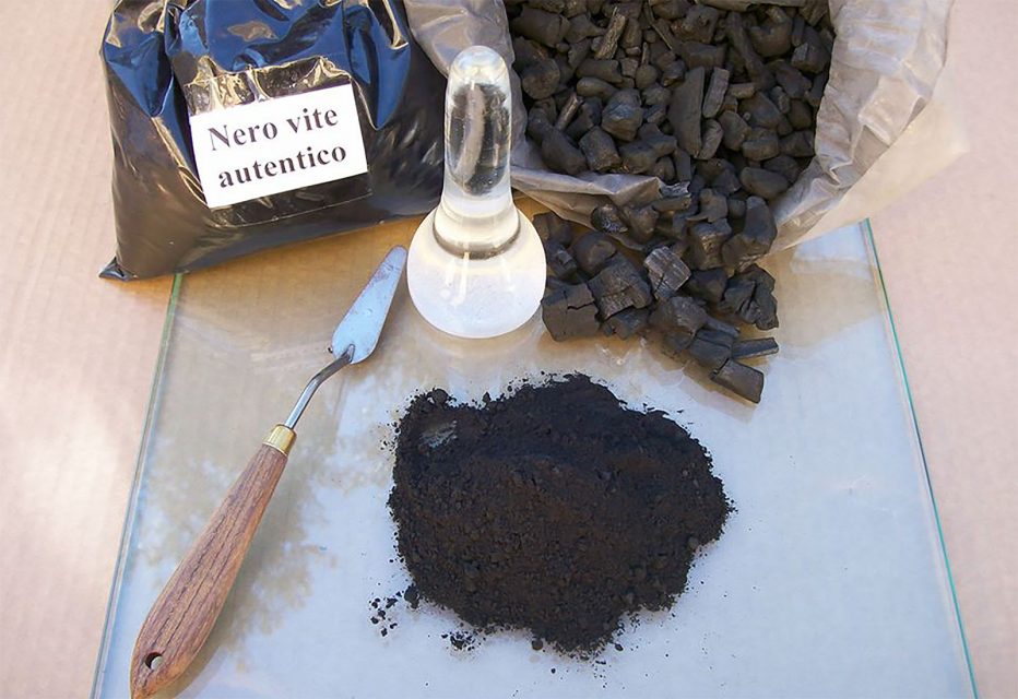 Anche il nero di vite (Foto 2), ottenuto triturando il carbone di legna originato dalla combustione dei tralci di questa pianta, era molto diffuso e apprezzato. Altri pigmenti simili venivano invece ricavati dalla combustione degli scarti della lavorazione dell’avorio (un pigmento noto appunto come nero d’avorio), dai gusci delle mandorle o dai noccioli delle pesche.