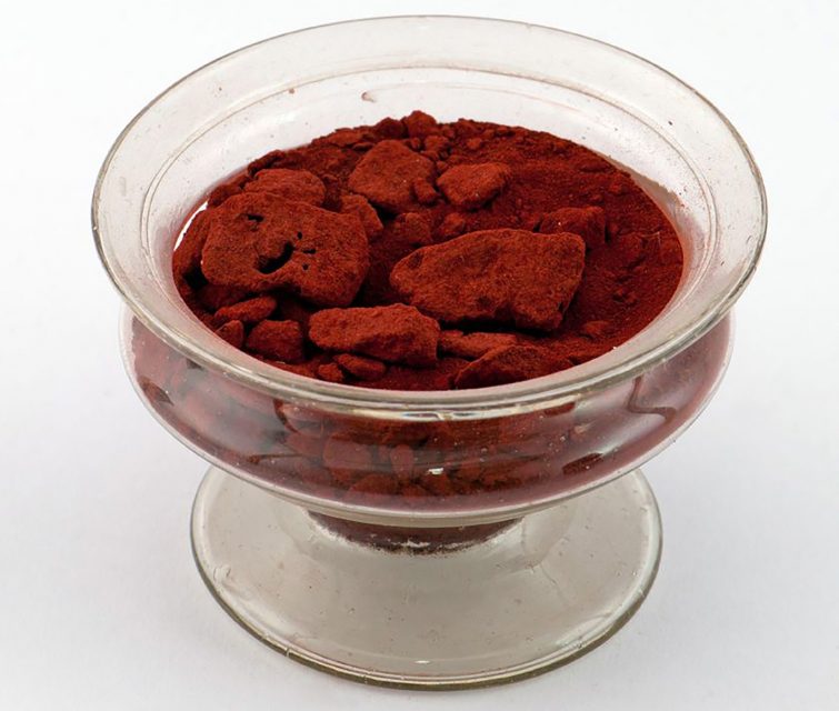 Esistevano numerose varietà anche di pigmenti rossi, generalmente prodotte raffinando varie terre naturali. Una delle più apprezzate era ad esempio la sinopia, utilizzata soprattutto per la realizzazione dei disegni preparatori degli affreschi (oggi noti appunto con questo termine – Foto 3): si trattava di un colore assai versatile, adatto per la realizzazione di affreschi, pitture a calce e tempere su tavola. Il cinabro era invece ritenuto assai pregiato. Ne esistevano due tipi: naturale, ricavato dalla macinazione della cinabrite o rosso di mercurio reperibile ad esempio sul Monte Amiata (Foto 4), e artificiale. Cennino descrive soprattutto quest’ultimo, consigliando di acquistarlo già pronto presso uno speziale di provata serietà, perché dato il suo alto costo veniva spesso adulterato con minio o cocciopesto.
