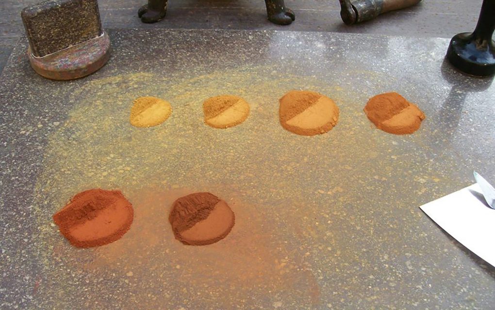 Foto 9 – I principali colori ottenibili dalle terre di Siena, che coprono numerose sfumature di giallo, giallo-bruno, nocciola, arancione e rosso mattone. Cortesia di Antonio Martorelli (Restauro & Colore s.r.l.)