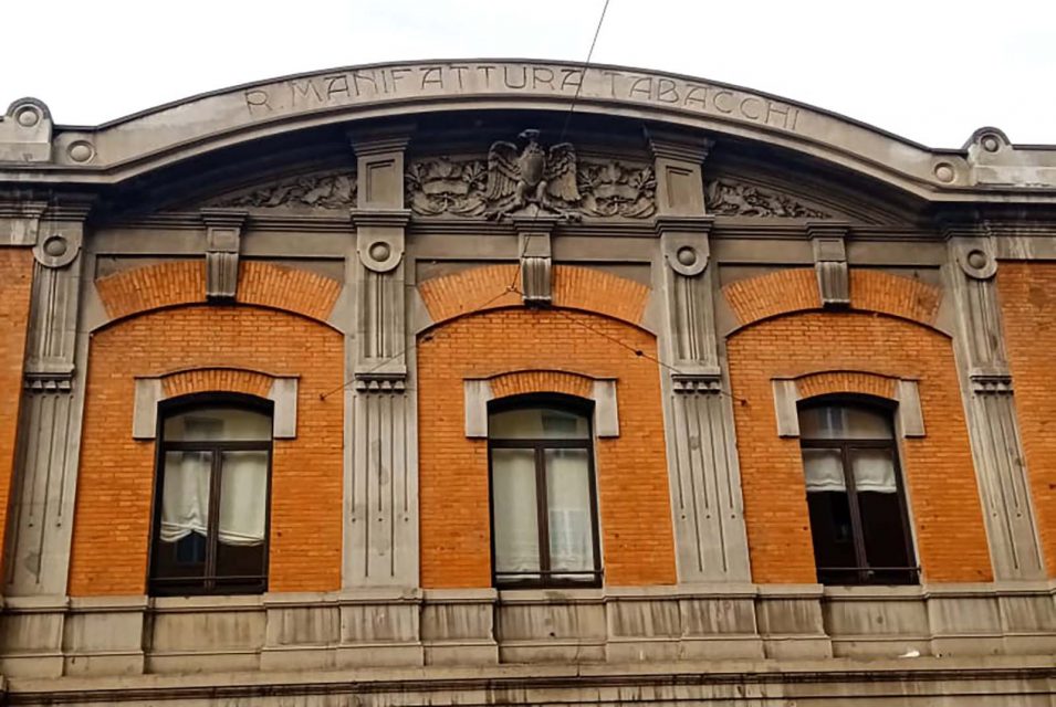 Particolare della facciata principale della Manifattura Tabacchi di Bologna (1906), un classico esempio di edificio industriale in stile liberty