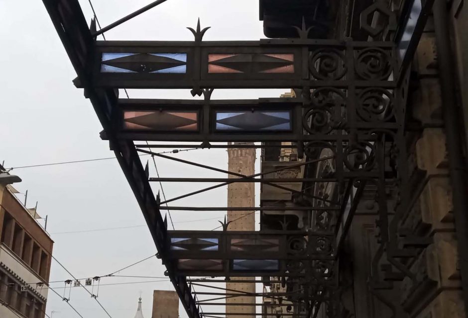 Bologna, via Rizzoli: pensilina liberty in ferro battuto e vetri colorati, purtroppo pesantemente danneggiata da un bombardamento aereo durante la Seconda Guerra Mondiale