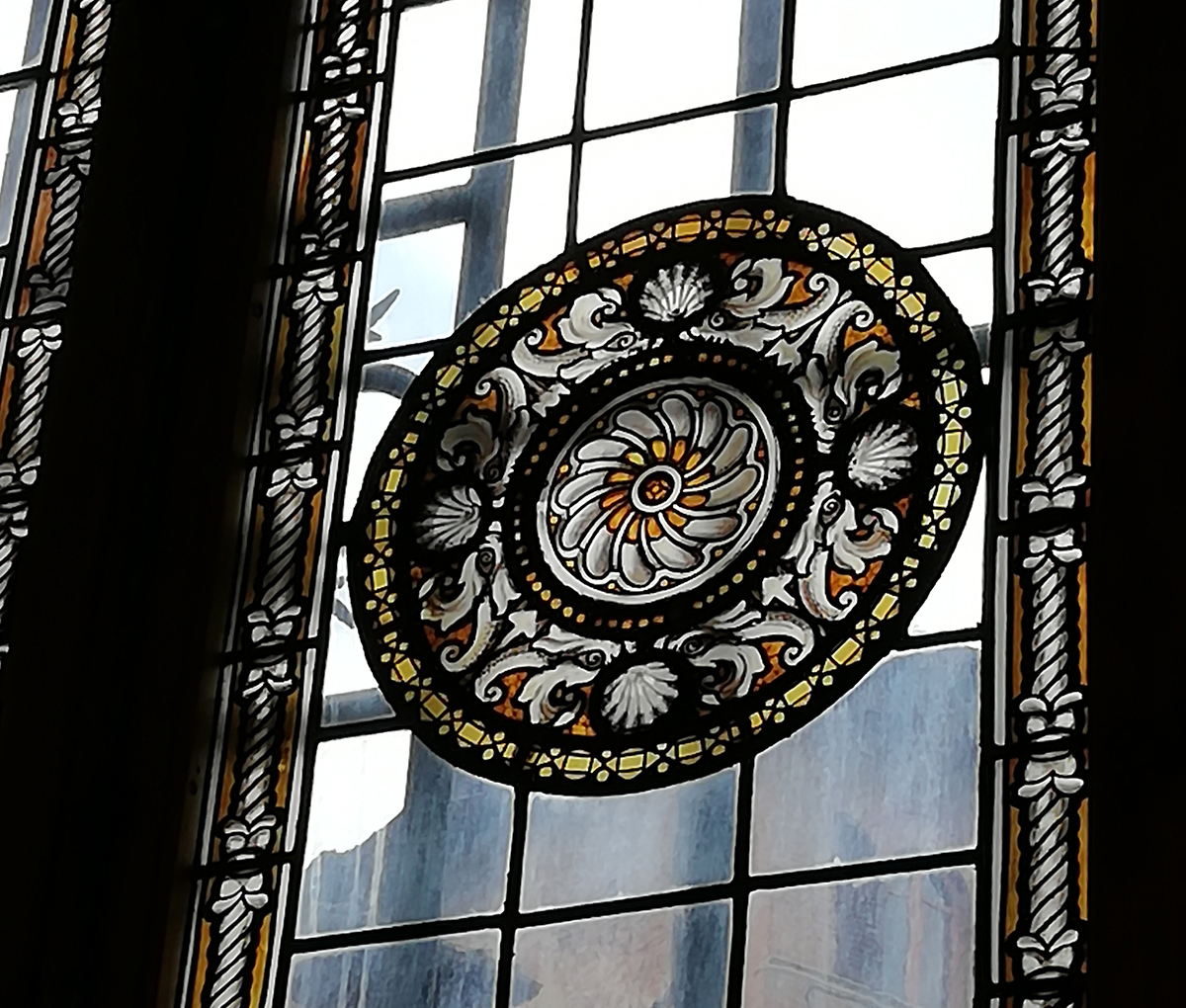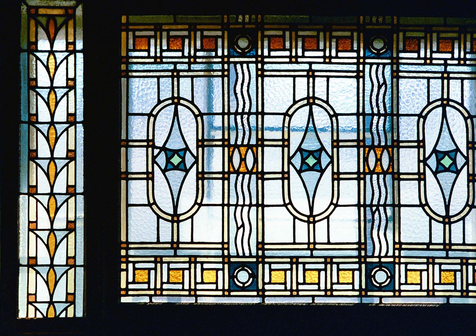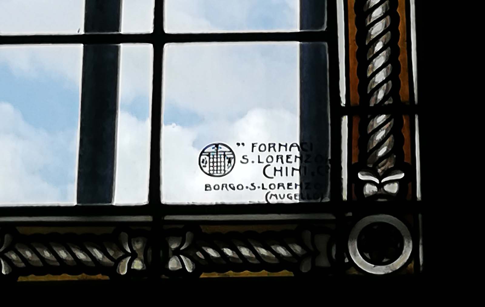 - Le vetrate decorate policrome, che nel periodo liberty possono essere costruite secondo la classica tecnica medievale (cioè assemblando vari tasselli di vetro colorato, traslucido o trasparente, con listelli di ferro o piombo – Figg. 6 e 8), oppure dipingendo con gli appositi colori per vetro piccole lastrine di vetro trasparente: le vetrate di inizio ‘900 visibili ad esempio nella Posta Centrale di Siena (Figg. 9 e 10) sono del secondo tipo.
