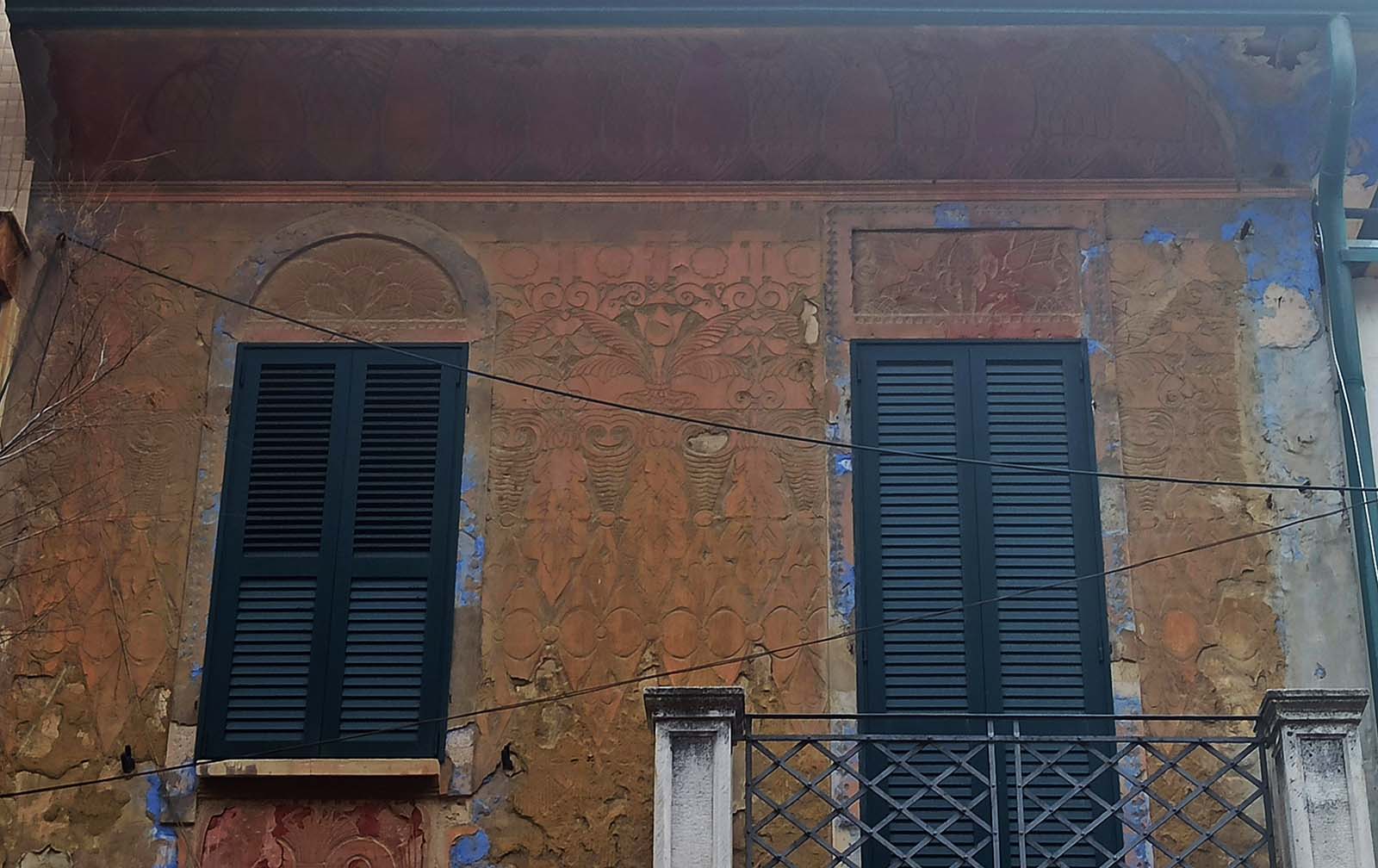 - Lo sgraffito, che – rispetto agli esemplari rinascimentali con la tipica bicromia bianco-nera della tecnica vasariana – ostentano spesso una ricca policromia di tre o più colori spesso assai vivaci. Un edificio nel centro storico di Riccione databile al 1920-1925 circa conserva ad esempio uno splendido intonaco a sgraffito con ben cinque colori (Fig. 11): rosa, nero, giallo ocra, rosso scuro e un azzurro cielo particolarmente intenso.