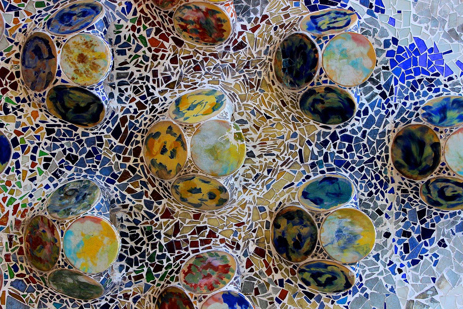 - Il mosaico, che nelle sue declinazioni più estrose e innovative assunse spesso l’aspetto del trencadìs, un particolare rivestimento ottenuto dall’accostamento con giunti di malta volutamente larghi e grossolani di frammenti irregolari di vetro, maiolica, specchio o porcellana, spesso ricavati dalla rottura (voluta o accidentale) di piastrelle, tazze, bottiglie, piatti o vas. Questa tecnica è tipica in particolare delle opere dell’architetto catalano Antony Gaudì, tra cui ad esempio Parc Güell o Casa Batlló (Fig. 13).