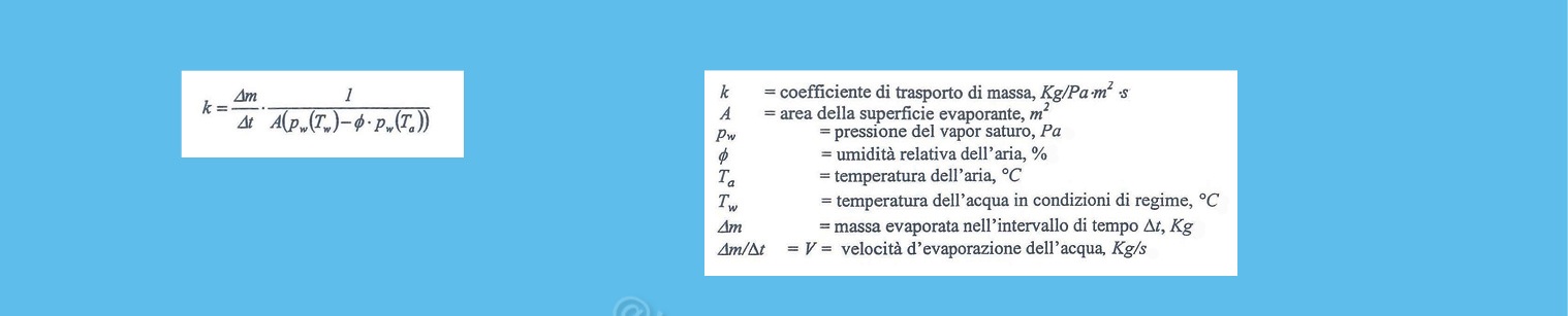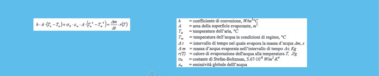 Il fenomeno dell’evaporazione dell’acqua da bacini chiusi quali laghi o piscine, benché costituisca un argomento di notevole interesse impiantistico e ambientale, non ha avuto un sufficiente sviluppo teorico e sperimentale, fino alla messa a punto da parte del CIRIAF (Centro Interuniversitario di Ricerca sull’Inquinamento da Agenti Fisici) di un apparato sperimentale, di concezione originale, per la determinazione della velocità di evaporazione dell’acqua da una superficie libera, in funzione delle condizioni termoigrometriche dell’aria (temperatura e umidità relativa), al variare della temperatura dell’acqua e per diversi regimi di moto.