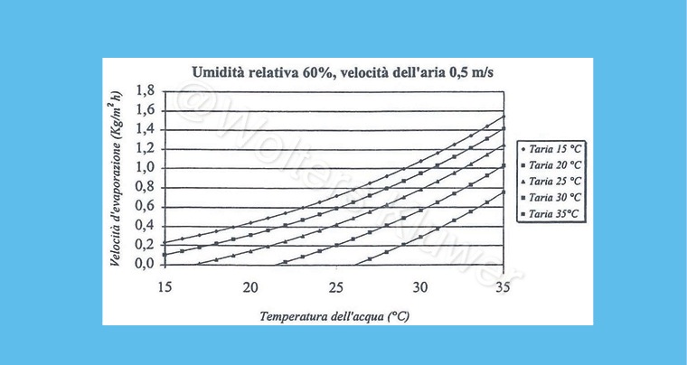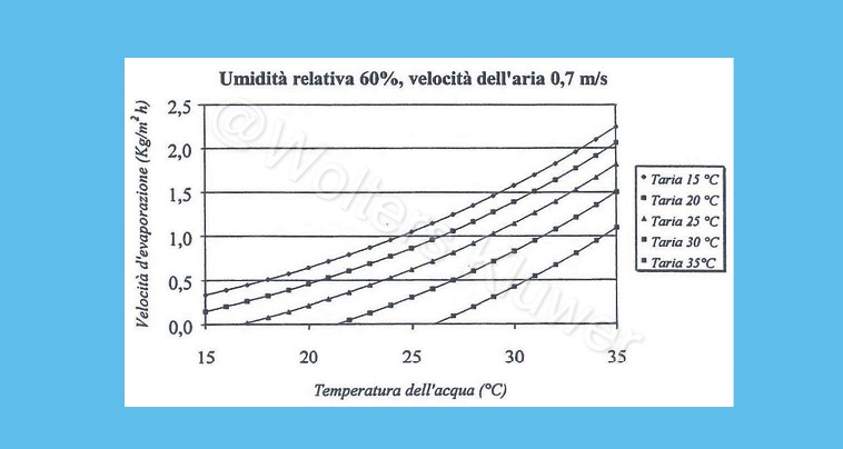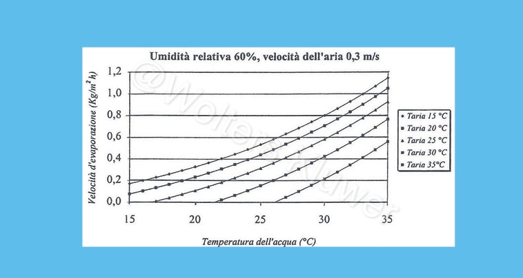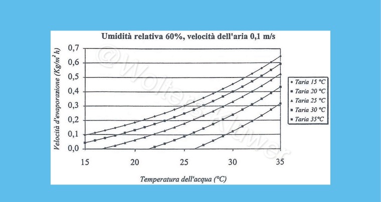 I dati sperimentali, disponibili in un ampio intervallo di temperature e umidità relative, costituiscono un valido riferimento nella progettazione degli impianti degli ambienti piscina e nella valutazione delle portate di reintegro dei bacini chiusi.
