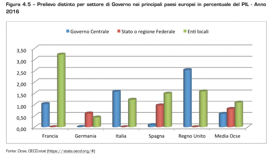 Osservando la figura, inoltre, è possibile notare come in Italia, nel 2016, il valore associato al prelievo nel 2016 sia più basso di quello raggiunto nel 2014 e nel 2015, fenomeno che trova la sua spiegazione nell’esenzione ai fini IMU e TASI delle abitazioni principali.