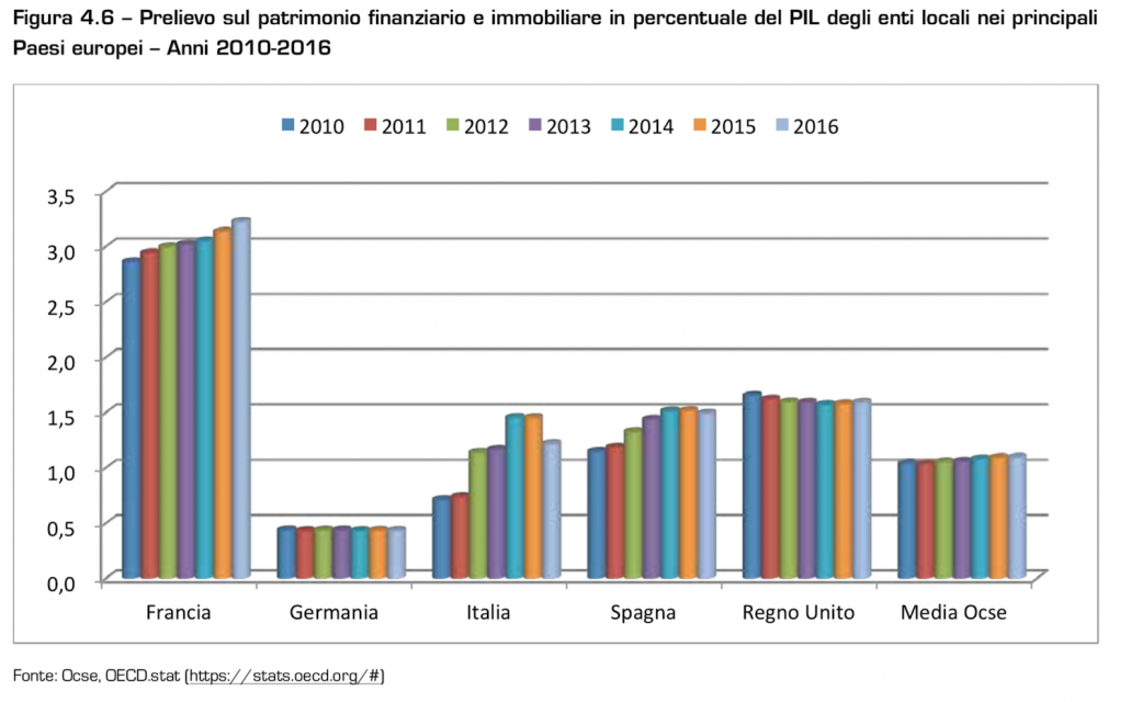 L’andamento del prelievo sul patrimonio finanziario e immobiliare in percentuale del PIL degli enti locali nei principali paesi europei, è illustrato con riferimento agli anni compresi tra il 2010 e il 2016.