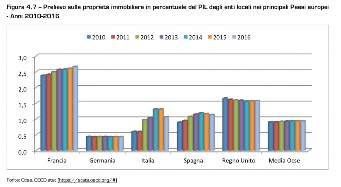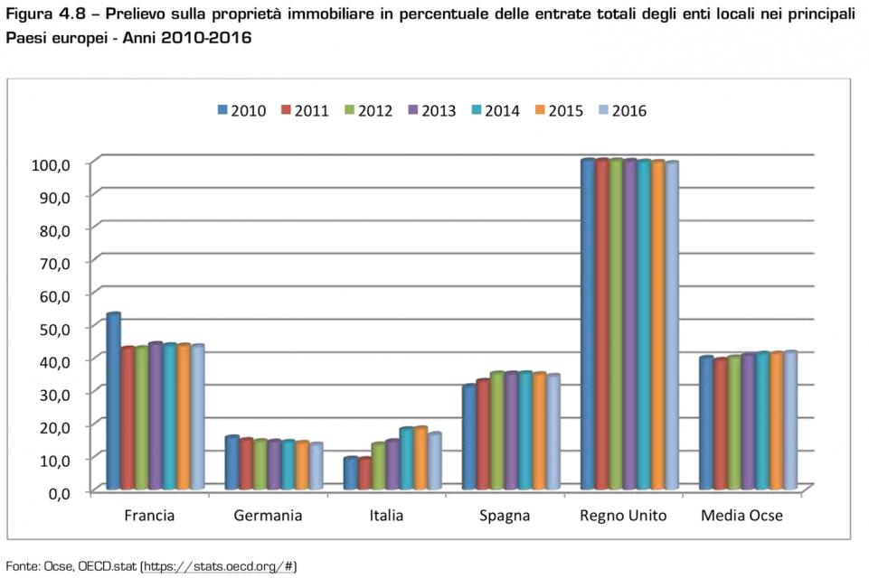 In Italia, invece, per gli enti locali, sono aumentate le entrate derivanti dalla tassazione immobiliare: dal 9,4% del 2010 si passa al 16,7% del 2016.