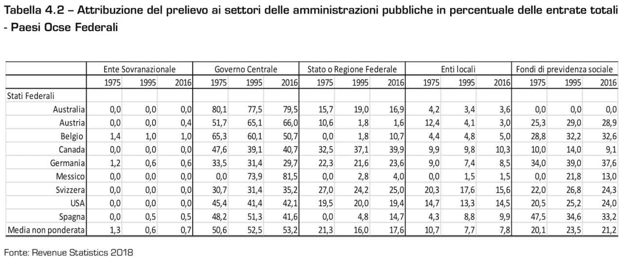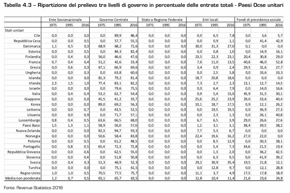 Risulta palese come, in generale, la ripartizione del prelievo sia fortemente a favore del Governo Centrale. Basti solo osservare la media: 65,1% nel 1975, 65,7% nel 1995, 63,5% nel 2016. Per quanto riguarda i fondi di previdenza sociale, anche nel caso di molti Stati unitari si assiste ad un aumento del prelievo, che per la Francia passa dal 40,6% al 52,8%, per la Turchia dallo 0% al 28,8%, per il Giappone dal 29% al 40,4%. In Italia il valore invece si abbassa (dal 45,9% al 30,1%) mantenendosi comunque significativo.