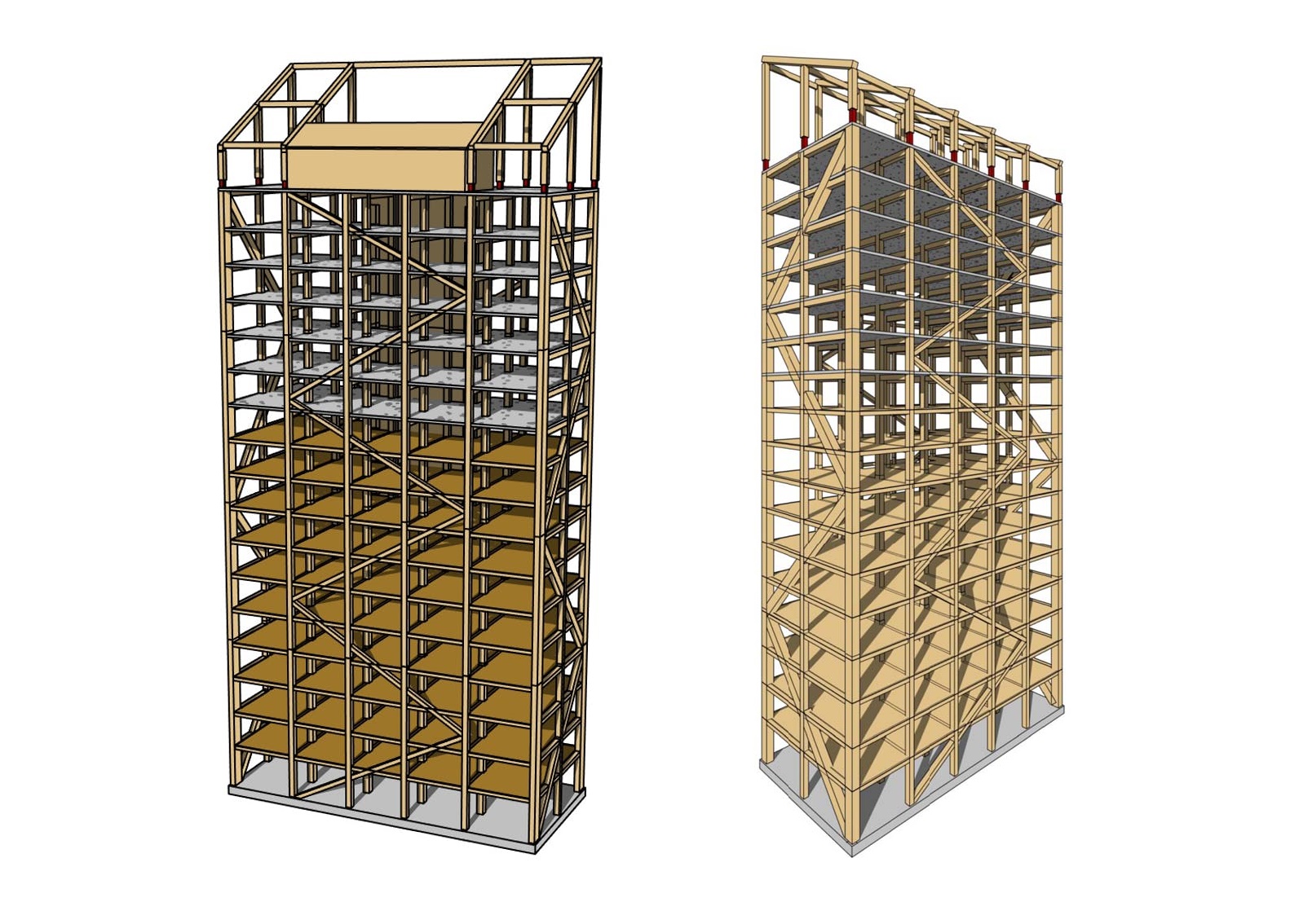 In costruzione nella città di Brumunddal, la “Mjøsa Tower” è destinata ad essere l’edificio in legno più elevato su scala internazionale, battendo di poco l’HoHo in ultimazione a Vienna (84 m e 24 piani). La struttura principale è del tipo a telaio, dunque con colonne, travi e diagonali in legno lamellare. La sezione trasversale delle 4 colonne angolari è 1.485 x 625 mm2, mentre quelle tipiche delle omologhe interne sono di 725 x 810 mm2 e 625 x 630 mm2. Circa le travi, esse possiedono geometria rettangolare, con dimensioni di 395 x 585 mm2 e 395 x 675 mm2 per quelle a supporto dei solai lignei, mentre nelle similari a sostegno delle solette in cls si hanno incrementi fino a 625 x 585 mm2 e 625 x 720 mm2. Invece, il massimo ingombro della sezione trasversale diagonale misura 625 x 990 mm2. Le classi di resistenza di tali elementi in “glulam” sono GL30c e GL30h secondo la norma EN 14080:2013. Il CLT, invece, è impiegato per realizzare i setti dei vani ascensore e scale, a cui si solidarizzano elementi lastra costituiti da travi in legno lamellare e impalcato in LVL (Trä8, della ditta fornitrice Moelven). Il valore della sua resistenza alla flessione (fm,k) è pari a 24 MPa. La torre norvegese, tuttavia, si vanta nell’adottare un approccio maggiormente purista nei materiali rispetto alla soluzione composita austriaca: essa impiegando solamente 2.600 m3 di legno lamellare in abete rosso, LVL e CLT anziché combinare legno (75%) al calcestruzzo. La soluzione ibrida, ottenuta dunque abbinando uno o più core in cls armato a strutture a telaio in lamellare o dal comportamento scatolare in CLT, venne già percorsa in altre soluzioni progettuali, come ad esempio nella Brock Commons a Vancouver. In realtà, anche l’edificio scandinavo pare non sia integralmente realizzato in legno, come emergerà nei paragrafi a seguire.