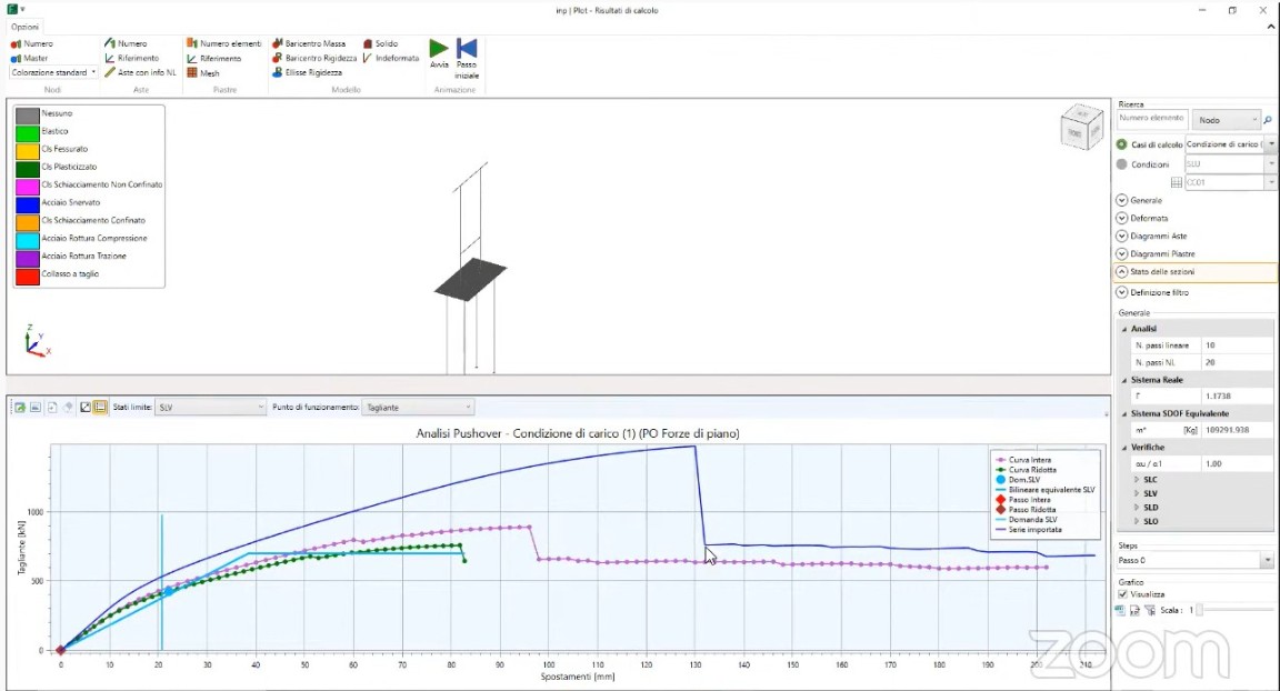 Figura 5: Curve di capacità: curva blu struttura integra e curva, color magenta, struttura con degrado inglobato. In quest’ultimo caso, si registra una riduzione del taglio alla base di oltre il 40% e  una discreta riduzione della capacità di spostamento (STACEC)