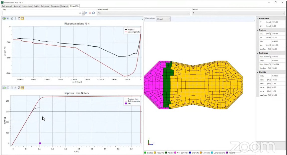 Figura 6: Curve di risposta: in alto a sinistra si nota una perdita di energia dissipata a livello di sezione – curva verde – rispetto alla sezione integra – curva rossa. In basso a sinistra, a livello di singola barra di acciaio, si nota una notevole perdita di duttilità. A destra, la sezione nel modello a fibra a plasticità diffusa (STACEC)