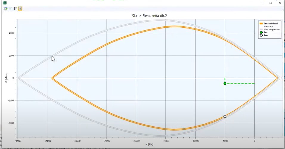 Figura 7: Domini di rottura: la linea gialla corrisponde alla riduzione di resistenza imputabile  alla sezione danneggiata (STACEC)