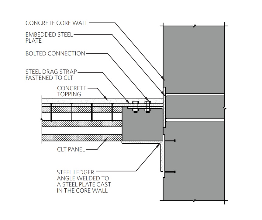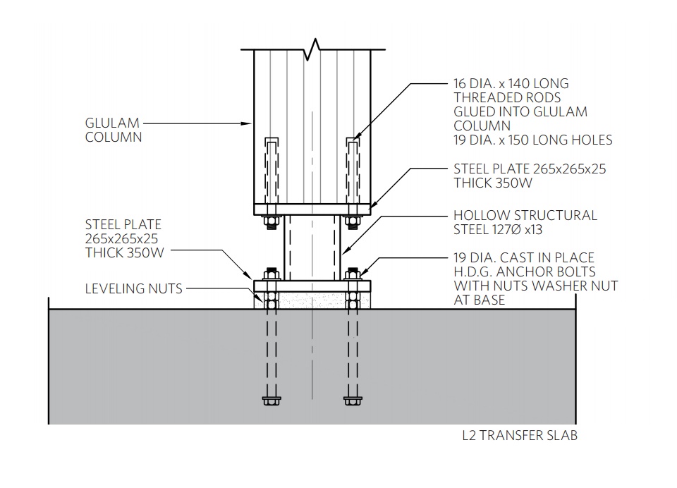 Gli elementi portanti lignei sono dotati di connettori metallici in grado di assicurare la continuità tra i pilastri e risolvere il nodo costruttivo degli stessi con i pannelli a 5 strati dei solai di piano in CLT (ossia Cross Laminated Timber), come richiesto dalla normativa canadese in materia di antisismica. I pilastri lamellari sono 78 a piano, per un totale di 1.298 nell’intero edificio, le cui dimensioni geometriche variano da 265x265x2.810 mm, nei livelli 2 al 9, fino a 265x215x2.810 mm, nei restanti piani superiori. In tale numero sono ricompresi quelli in PSL, collocati in aree di carico fortemente sollecitate tra i piani 2 e 5 e con maglia pari a 4,0×2,85 m.