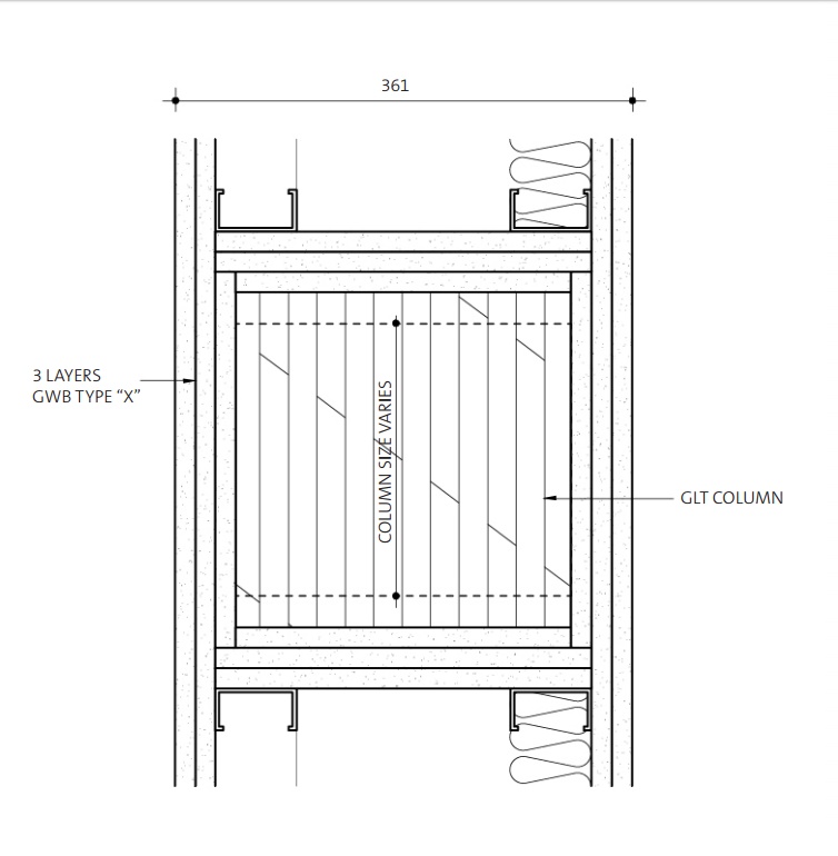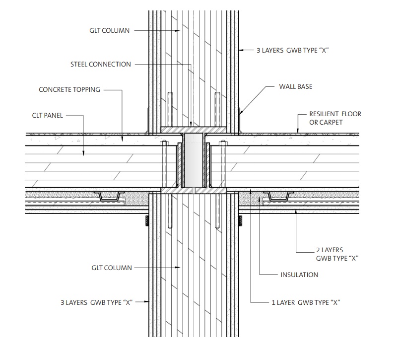Dal punto di vista della protezione dal fuoco, i componenti in CLT e in legno lamellare utilizzati nel progetto sono protetti da un incapsulamento costituito da 3 – 4 lastre sovrapposte in fibra di gesso ignifugo (“Type X”), con l’obiettivo di raggiungere i requisiti della classe di resistenza pari a 60 e 120 minuti. A questi è accoppiato un sistema di sprinkler, in grado di operare con un proprio serbatoio indipendente da 20.000 litri rispetto all’impianto di acqua corrente, anche in mancanza di corrente elettrica.