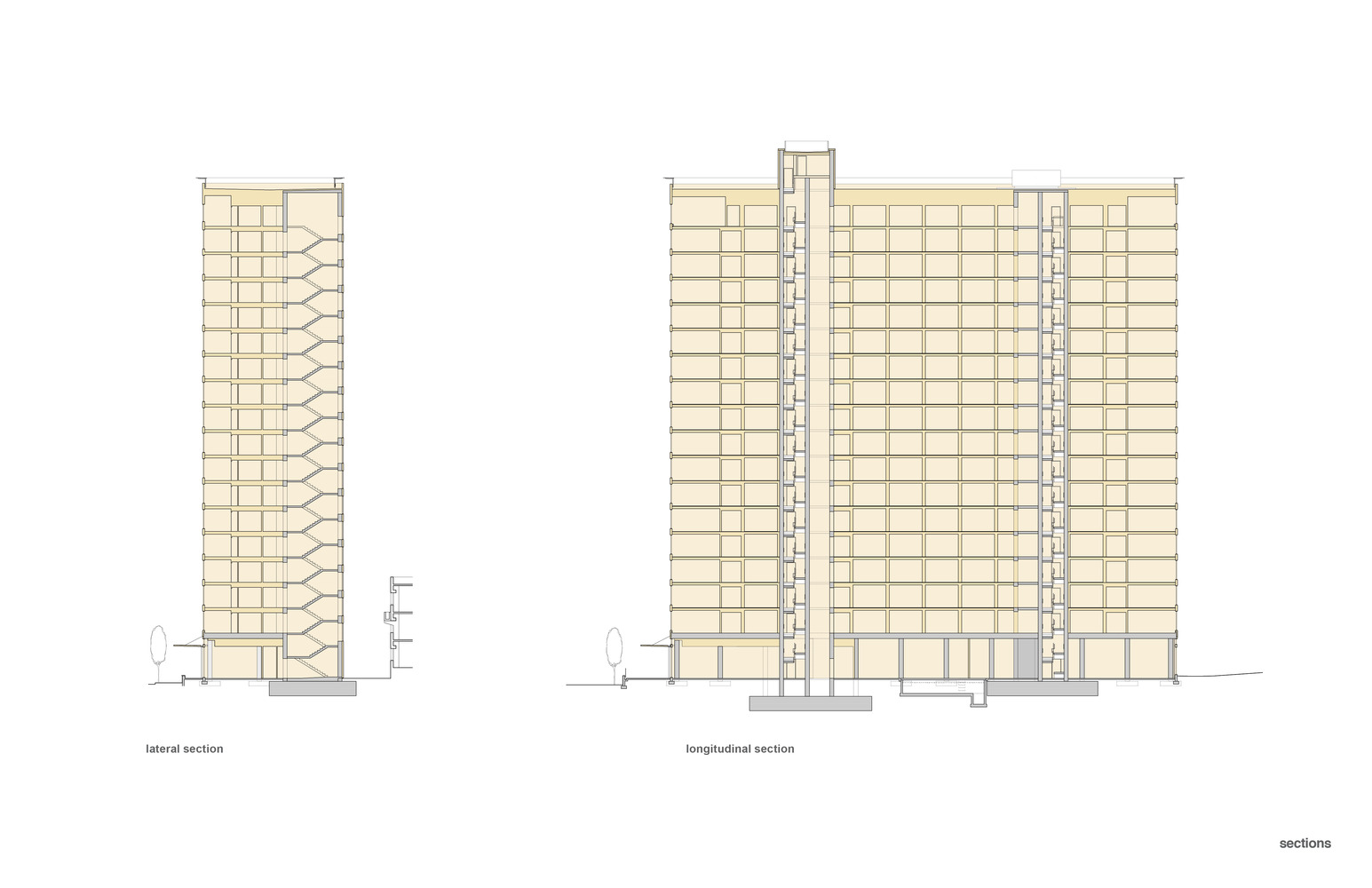 La struttura prevede un sistema costruttivo misto, in cui le partizioni orizzontali di piano sono imbullonate e ancorate ai 2 cores in calcestruzzo, mentre gli elementi puntiformi verticali sono tirafondati ad un podium in cls armato e gettato in opera, dell’altezza di un livello. Tali nuclei scale e ascensore garantiscono la stabilità laterale al complesso, nonché al taglio, mentre i carichi gravitazionali sono trasmessi ai plinti e alla platea di fondazione grazie al telaio in legno lamellare. Il sistema fondante è composto da plinti aventi dimensioni pari a 2,8×2,8×0,7 m e da un cordolo perimetrale dalla sezione trasversale di 60×30 cm; al di sotto di ogni core è prevista una platea avente spessore di 160 cm.
