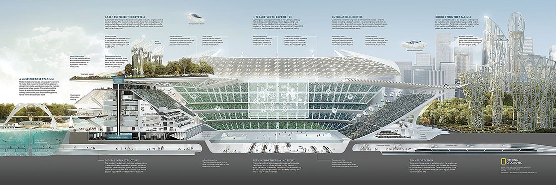 La società ha risposto a una richiesta arrivata da National Geographic tracciando le sue linee guida per lo stadio del futuro e ipotizzando forme e attrezzature per un edificio a cui, nonostante il progresso tecnologico, i millenni trascorsi dai primi esempi e necessità sempre nuove, continua a essere richiesto di assolvere principalmente a una funzione: permettere al pubblico più vasto possibile l’esperienza ottimale delle competizioni sportive.