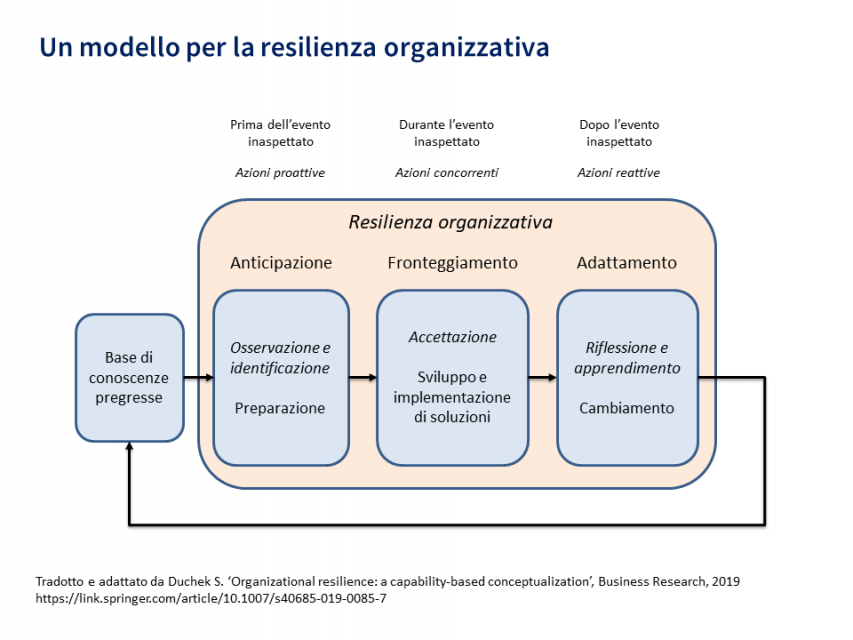 Fra i numerosi modelli che descrivono componenti e fasi della resilienza organizzativa, quello di Duchek (2019) sembra rappresentare molto bene il concetto e il suo processo (fig. 1).