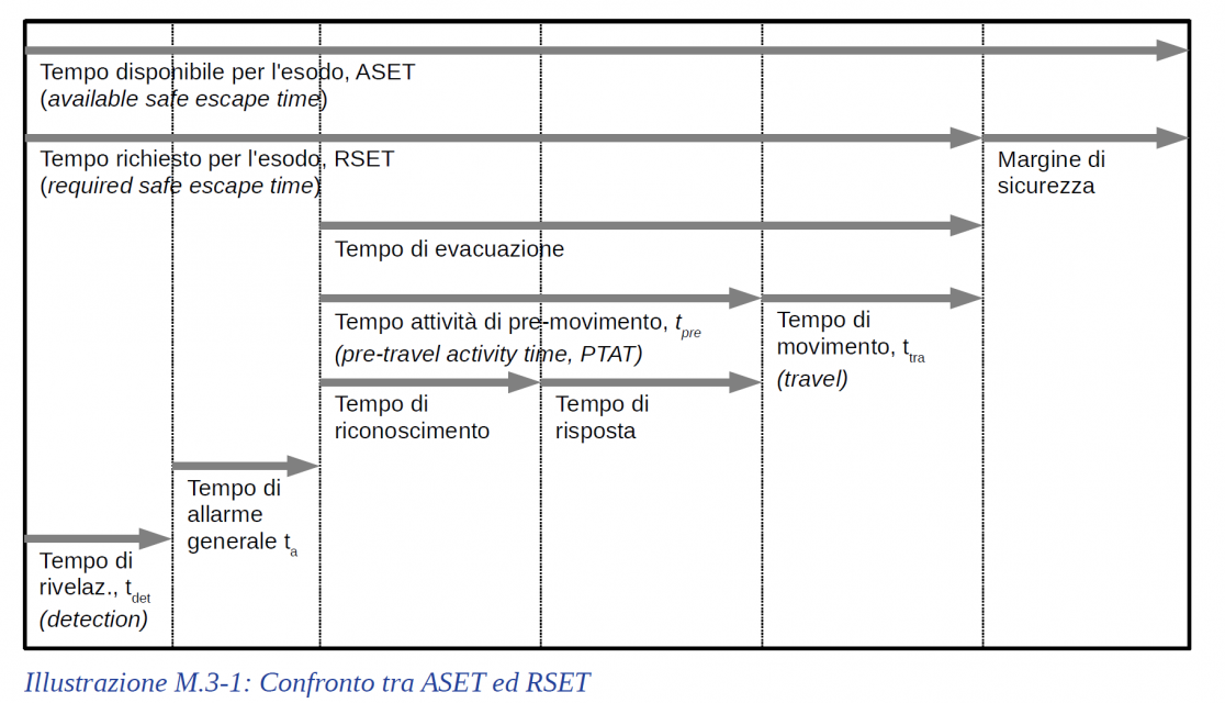 Per la verifica dell’RSET si fa riferimento alla determinazione dell’ASET (available safe escape time), ovvero dell’intervallo di tempo calcolato tra l’innesco dell’incendio ed il momento in cui le condizioni ambientali nell’attività diventano tali da rendere gli occupanti incapaci di porsi in salvo raggiungendo o permanendo in un luogo sicuro.