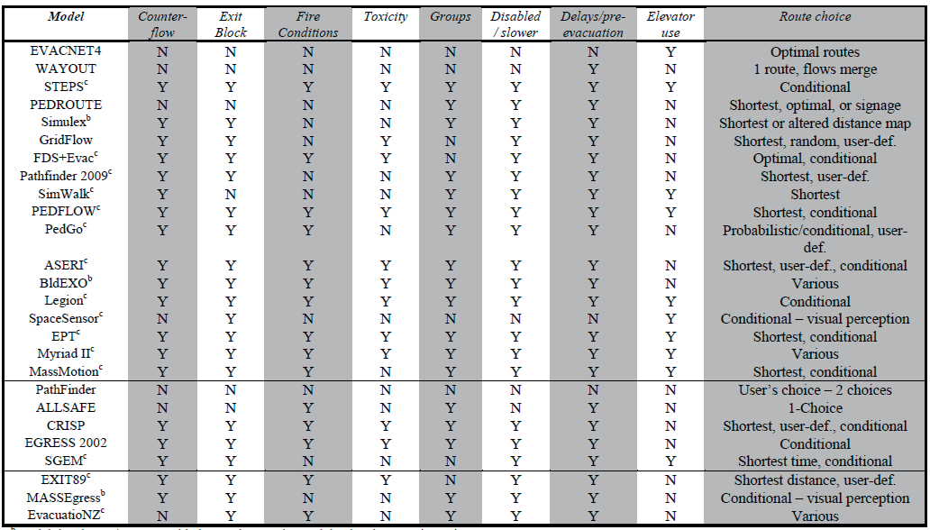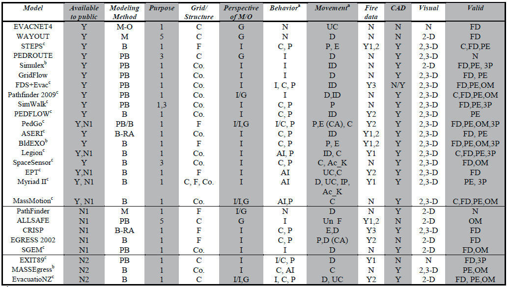 - Modelli disponibili al pubblico: EVACNET4, WAYOUT, STEPS, PedGo, PEDROUTE, Simulex, GridFlow, ASERI, FDS+Evac, Pathfinder, SimWalk, PEDFLOW, buildingEXODUS, Legion, SpaceSensor, Evacuation Planning Tool (EPT), e MassMotion.