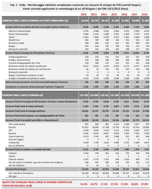 Per quanto riguarda in particolare l’overall target, la Tabella 1 mostra i dati relativi alle singole componenti che costituiscono il numeratore (Consumi finali lordi di energia da FER) e il denominatore (Consumi finali lordi di energia).