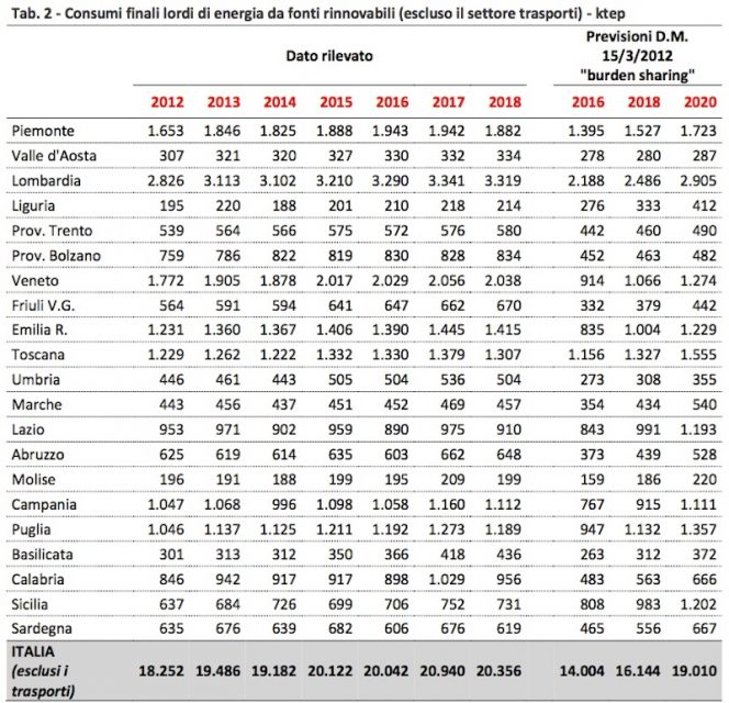 Nella Tabella 2 vengono confrontati i CFL da FER (consumi finali lordi da fonti rinnovabili) rilevati e i CFL da FER previsti dal D.M. 15 marzo 2012 (D.M. Burden sharing). Come si nota, il dato rilevato complessivo ottenuto dalla somma dei valori regionali/provinciali (per il 2018, ad esempio, 20.356 ktep) è pari alla differenza tra i CFL da FER calcolati per il monitoraggio dell’overall target nazionale (21.605,1 ktep: si veda la tabella 1) e i consumi del settore trasporti (1.249,6 ktep).