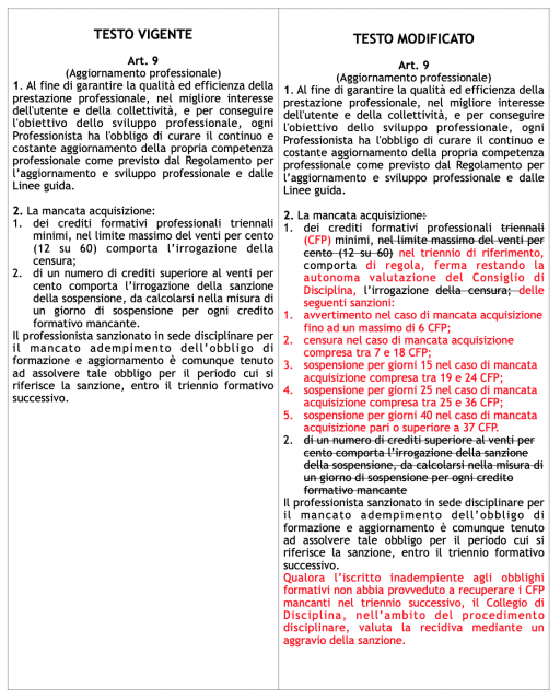 La modifica è l’esito di un lungo e partecipato confronto, nei gruppi operativi Deontologia e Formazione, in Delegazione Consultiva, in Conferenza degli Ordini, in Consiglio Nazionale. Con l’obiettivo di elaborare una revisione condivisa dei contenuti dell’art. 9, al fine di rivedere le sanzioni disciplinari nell’ambito delle mancanze connesse all’aggiornamento professionale. Rendendo omogenea l’azione disciplinare nel panorama nazionale.