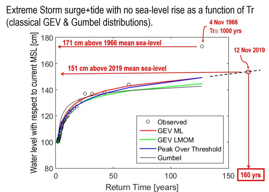 Per l’evento del 12 novembre 2019 (151 cm sul livello medio mare) si può invece stimare un tempo di ritorno di circa 160 anni, trattasi quindi di un evento che ha una probabilità di verificarsi in un dato anno di circa lo 0.6%”.