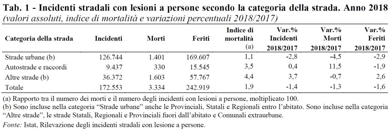 Rispetto al 2017, sulle autostrade si registra un aumento in termini di vittime (+11,50%), mentre sulle strade urbane ed extraurbane una diminuzione (rispettivamente -4,5% e -0,7%).