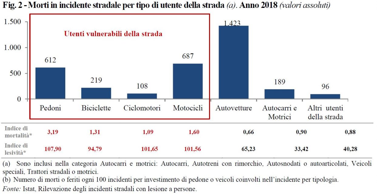 L’incidentalità stradale è pervasiva di ogni categoria. Ma i più penalizzati sono i soggetti vulnerabili su strada come pedoni, ciclisti, motociclisti. Nel 2018 emerge soprattutto l’aumento delle vittime tra i pedoni (+2,00%). Mentre gli utenti delle due ruote a motore e i ciclisti, benché facciano registrare segnali di miglioramento (ciclisti -13,8% e motociclisti -3,9%), restano pur sempre due categorie particolarmente a rischio e con un andamento oscillante nel tempo.