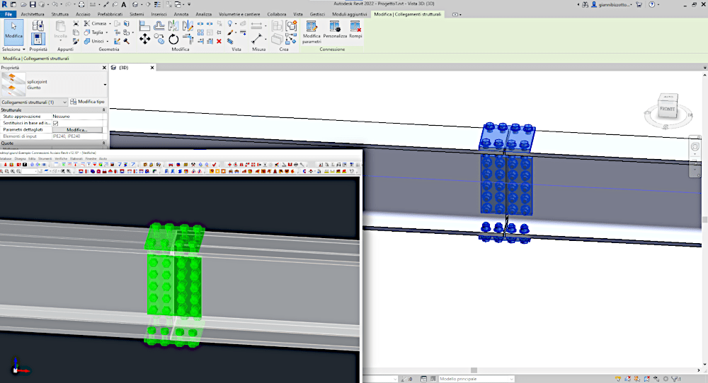 Giunzioni a flangia, squadretta, coprigiunti saldati o bullonati, sono ricreati in Revit 2022 sfruttando le funzionalità di Advance Steel, il software Autodesk per il disegno di dettaglio degli elementi in acciaio. Fazzoletti di lamiera, saldature, passo e tipologia di bullonature diventano quindi modificabili parametricamente per qualsiasi necessità pratica.
